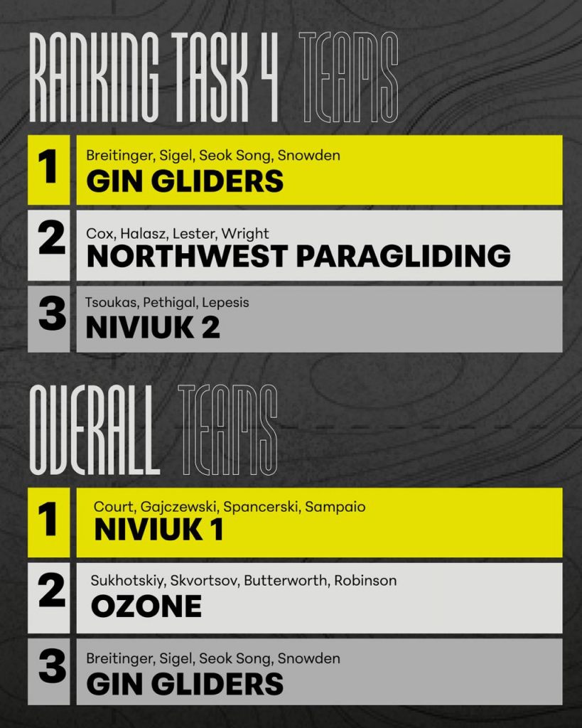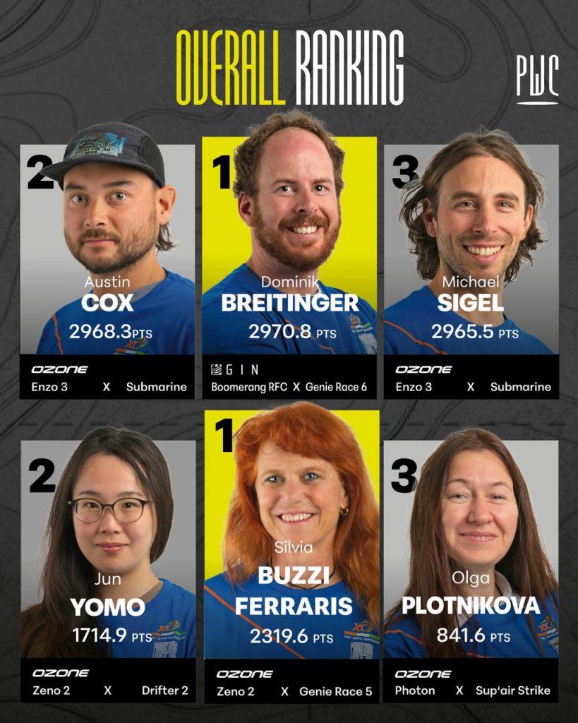 In the women’s competition, Silvia Vanda Angela Buzzi Ferraris maintains the overall lead with consistent results throughout the event. In the team classification, Niviuk 1 currently holds the top position.