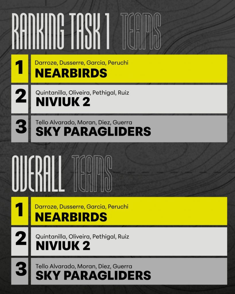 71 pilots made goal, with another 9 making the end of speed section but then being too low to reach goal. The task winner, Arthur Moindrot of France, completed the task with an average speed of 38.33 km/h. Baptiste Lambert was actually the first pilot to reach the End of Speed with an average of 38.47 km/h. Baptiste, Marcelo Sanchez Vilchez, and Honorin Hamard all reached the End of Speed faster than the eventual winners, and having lead much of the race had more leading points, but not being high enough to subsequently reach goal cost them the win–but made for a dramatic finish.