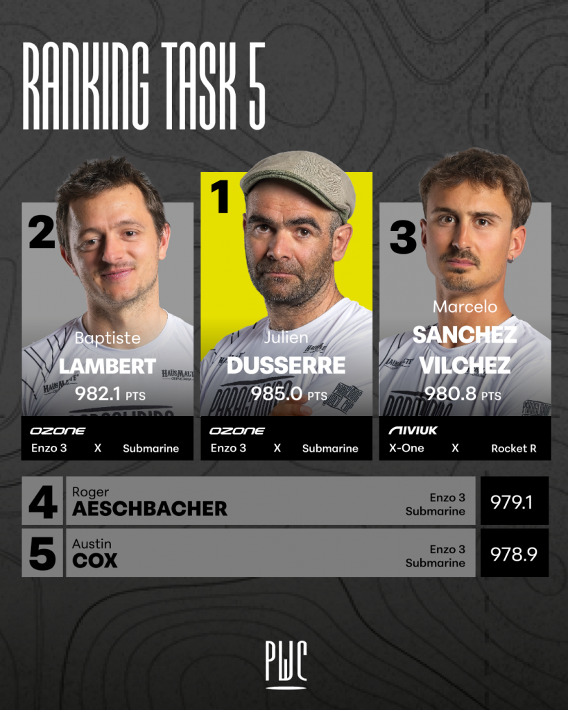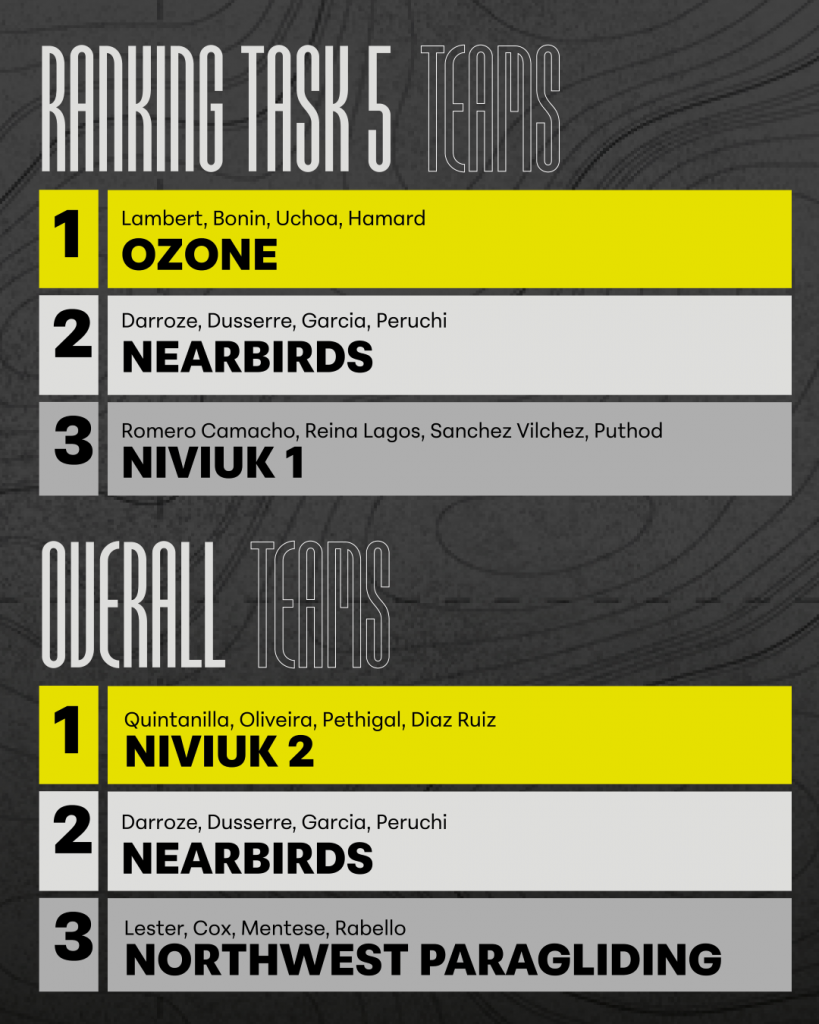 After 5 tasks the overall podium is still up for grabs with a dozen pilots all within range of a podium position. The team competition is tight as well, so the next two days will be hotly contested.