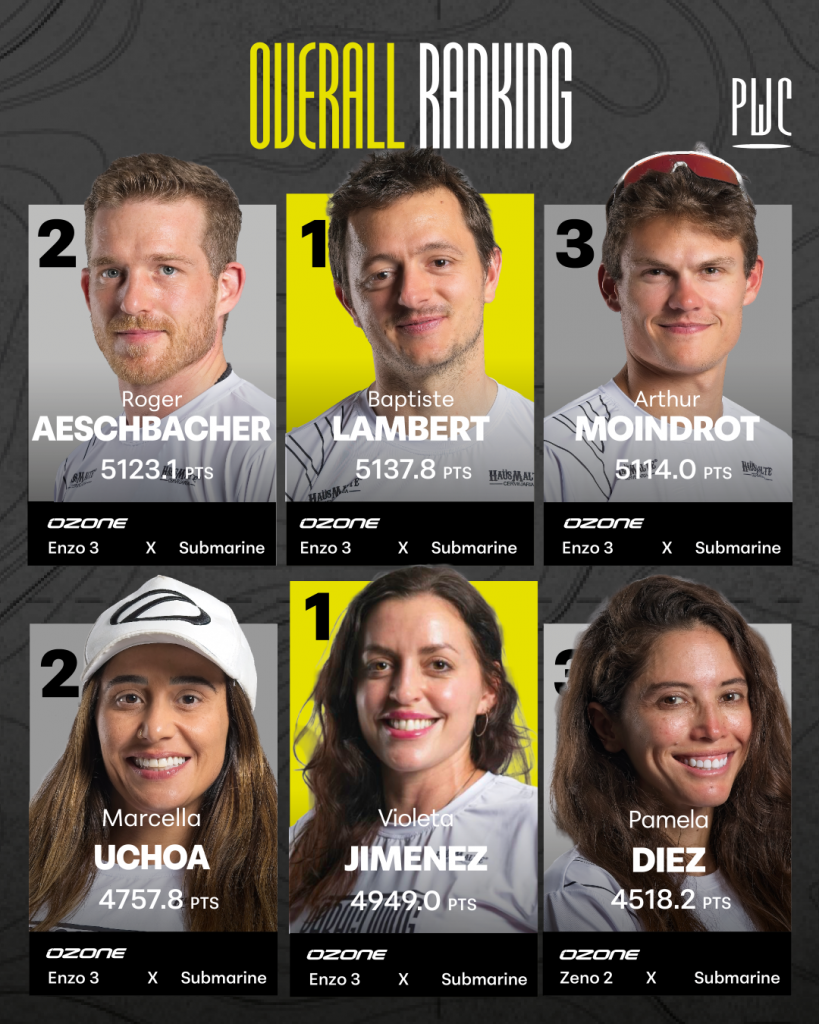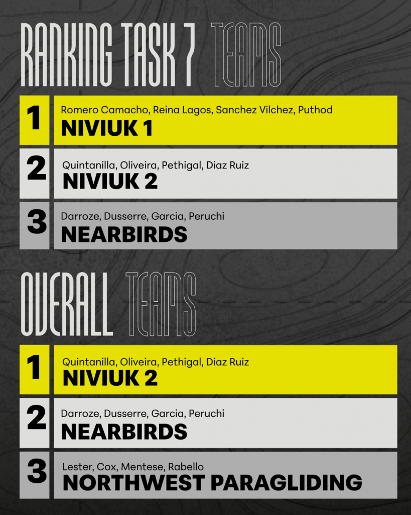 Baptiste Lambert‘s third place finish for task 7 was good enough to secure his spot atop the overall podium and Violeta Jimenez‘s solid finish in task 7 solidified her win in the Women’s category. The team podium was tight going into the final day but Niviuk 2 prevailed, having been the most consistent team of the week.
